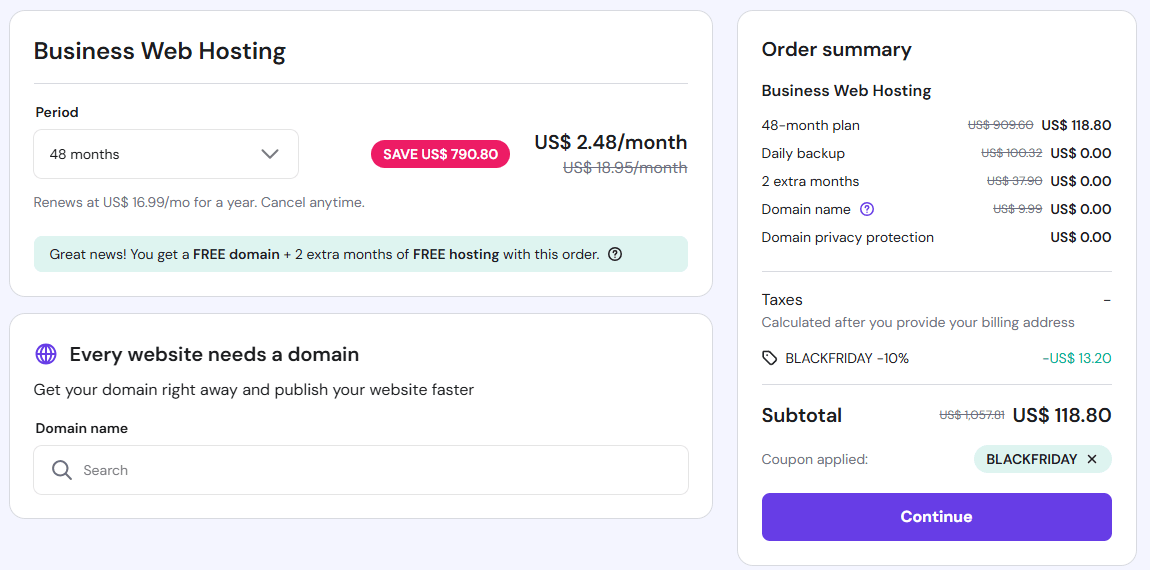 Hostinger特殊优惠码:除了价格打折,在购买过程中输入优惠码BLACKFRIDAY可以获得额外的10%降价优惠。