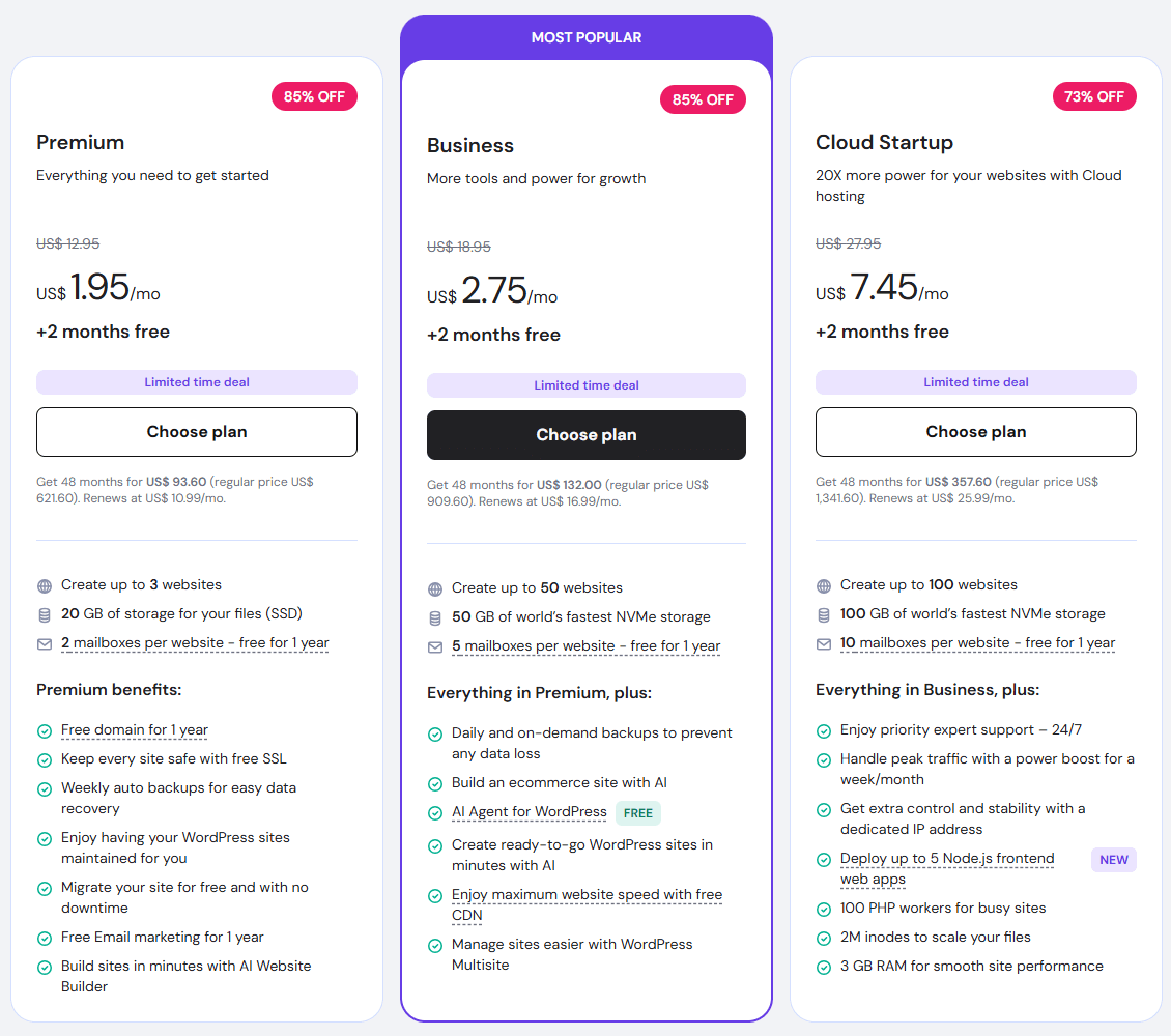 现在购买Hostinger主机,入门级的Premium主机最低价格仅需1.95美元/月,降价幅度高达85%,最受欢迎的Business主机套餐价格降至2.75美元/月,降价幅度高达85%。